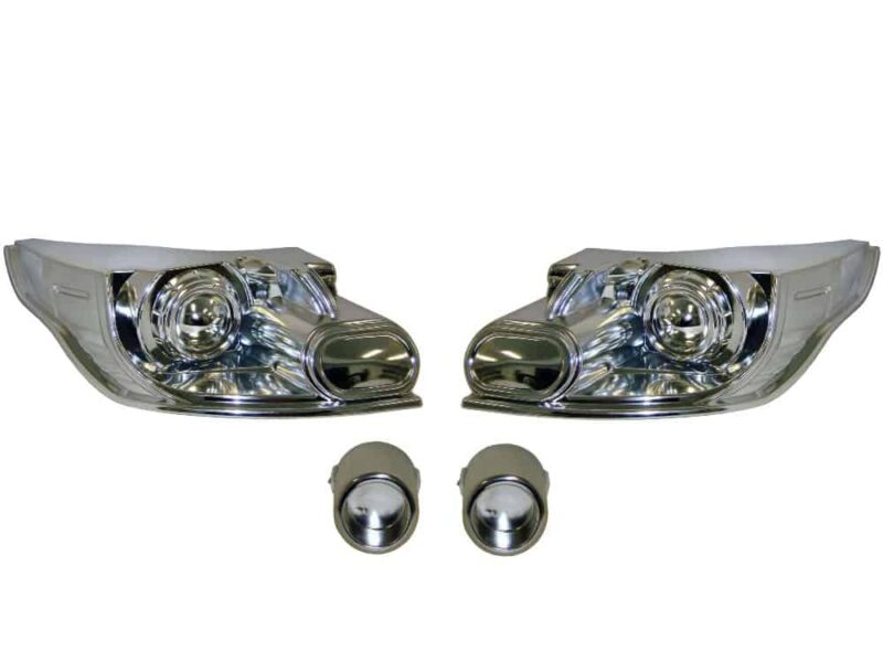 Replacement headlight assembly with exhaust tips. Lenses not included.